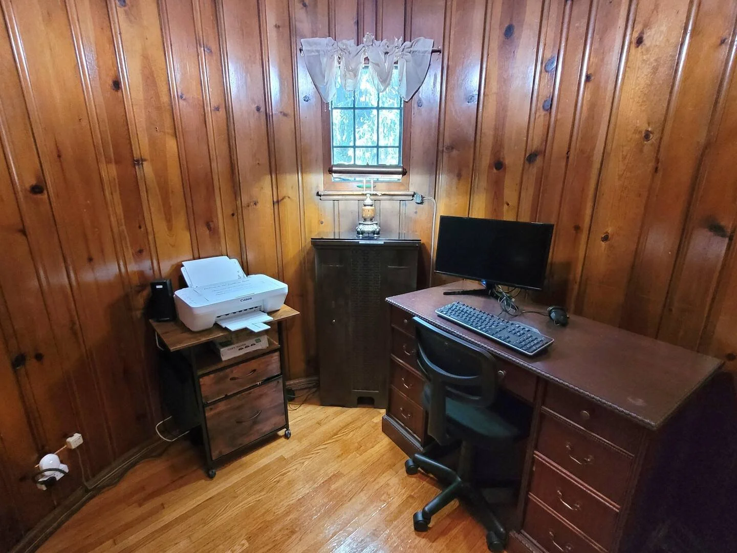 In addition, this room is away from the main activity, a door for privacy and nice backdrop of wooden bookshelves for taking those virtual meetings. -