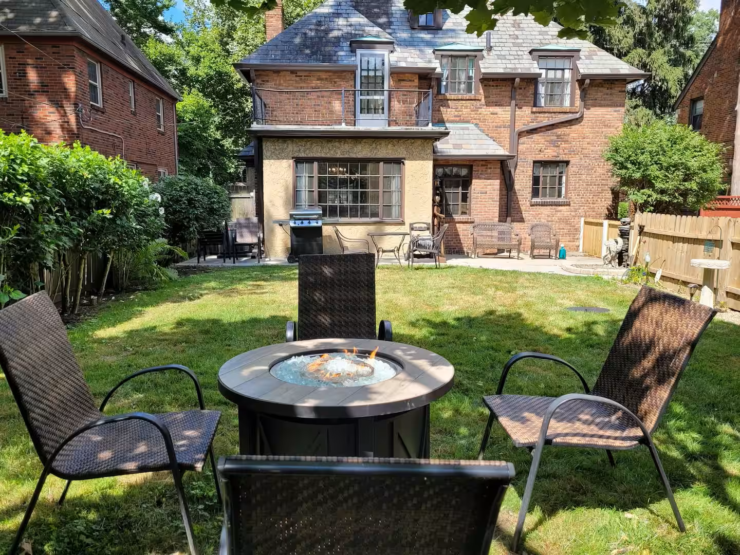 The wide-open layout of the rear lawn is great for a BBQ or evening hang-out. Gas grill and “fire table, the old well, concrete patio, landscaping and fencing make it a private and welcoming environment, with our faithful knight Sir Gerald standing guard over the sunroom entrance.