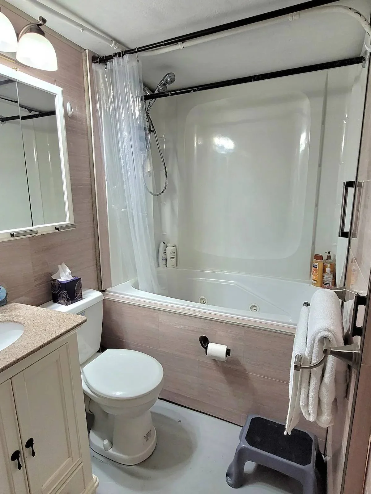 Located next to “The Lair”, Game Room, and Castle Laundry, this cozy but complete bathroom features jacuzzi tub and shower, commode and lavatory sink.