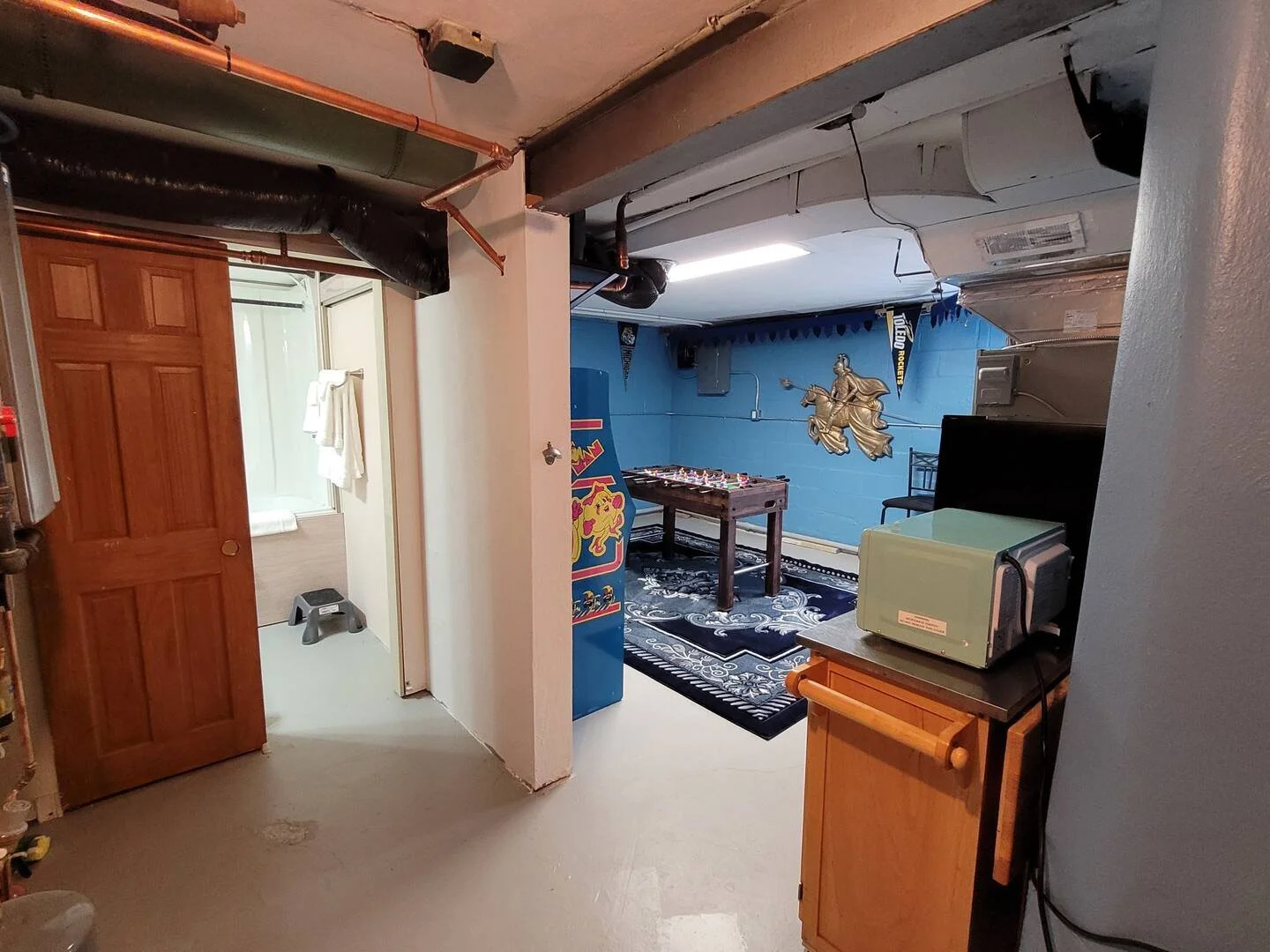 This gaming space has a foosball table, pinball table, and an arcade game with multiple classic 80s arcade games included.