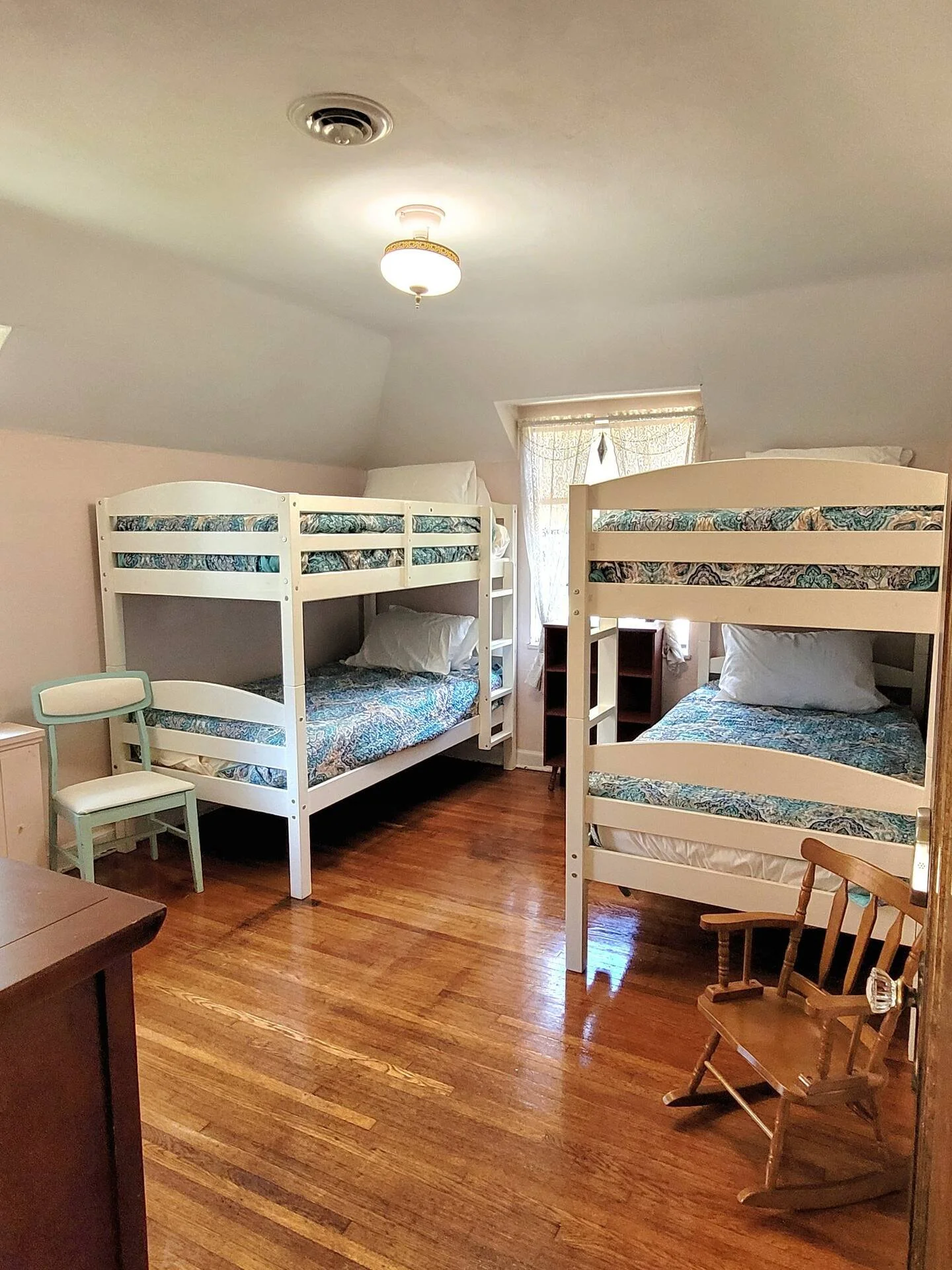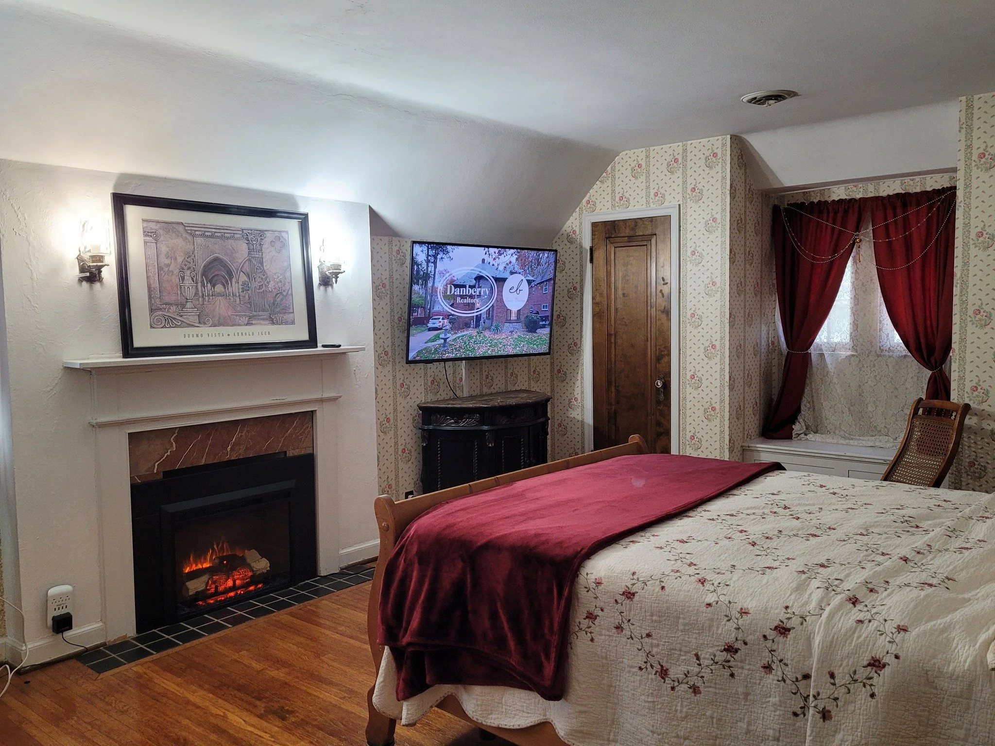 This bedroom features queen size bed, armoire and night stands, and large voice-controlled smart TV with video streaming services available for your login. This room and the King’s Chamber share a “Jack-n-Jill” style bathroom with shower in addition to the main hall bathroom on this floor with tub and shower surround.