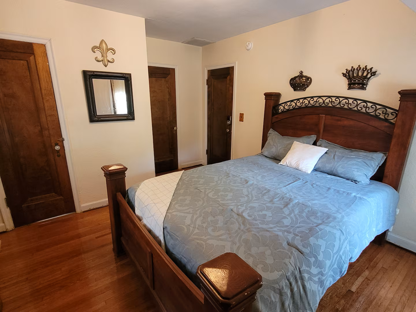 This bedroom features an adjustable queen bed, armoire and night stands, and large voice-controlled smart TV with video streaming services available for your login. This room and the Queen’s “Jack-n-Jill” style bathroom with shower in addition to the main hall bathroom on this floor with tub and shower surround.